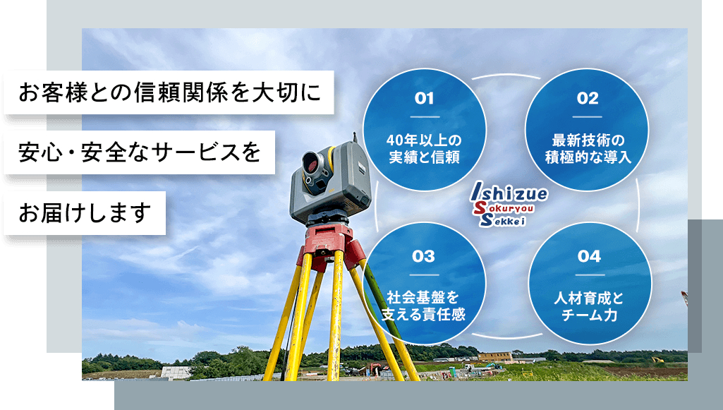 これからも確かな技術と豊富な知識を発揮し、「礎測量設計」が安全・安心の代名詞となるようなサービスをご提供いたします。
